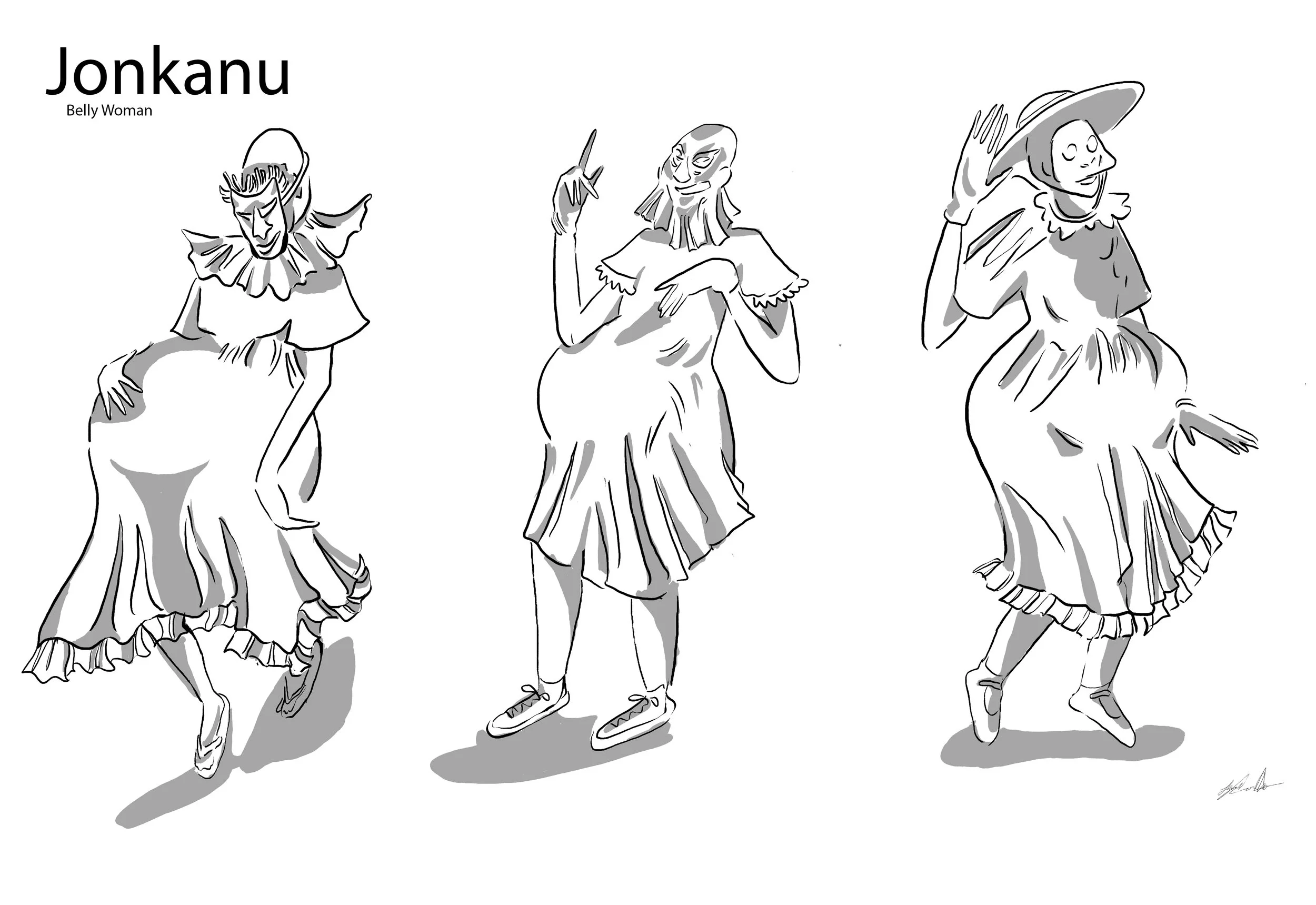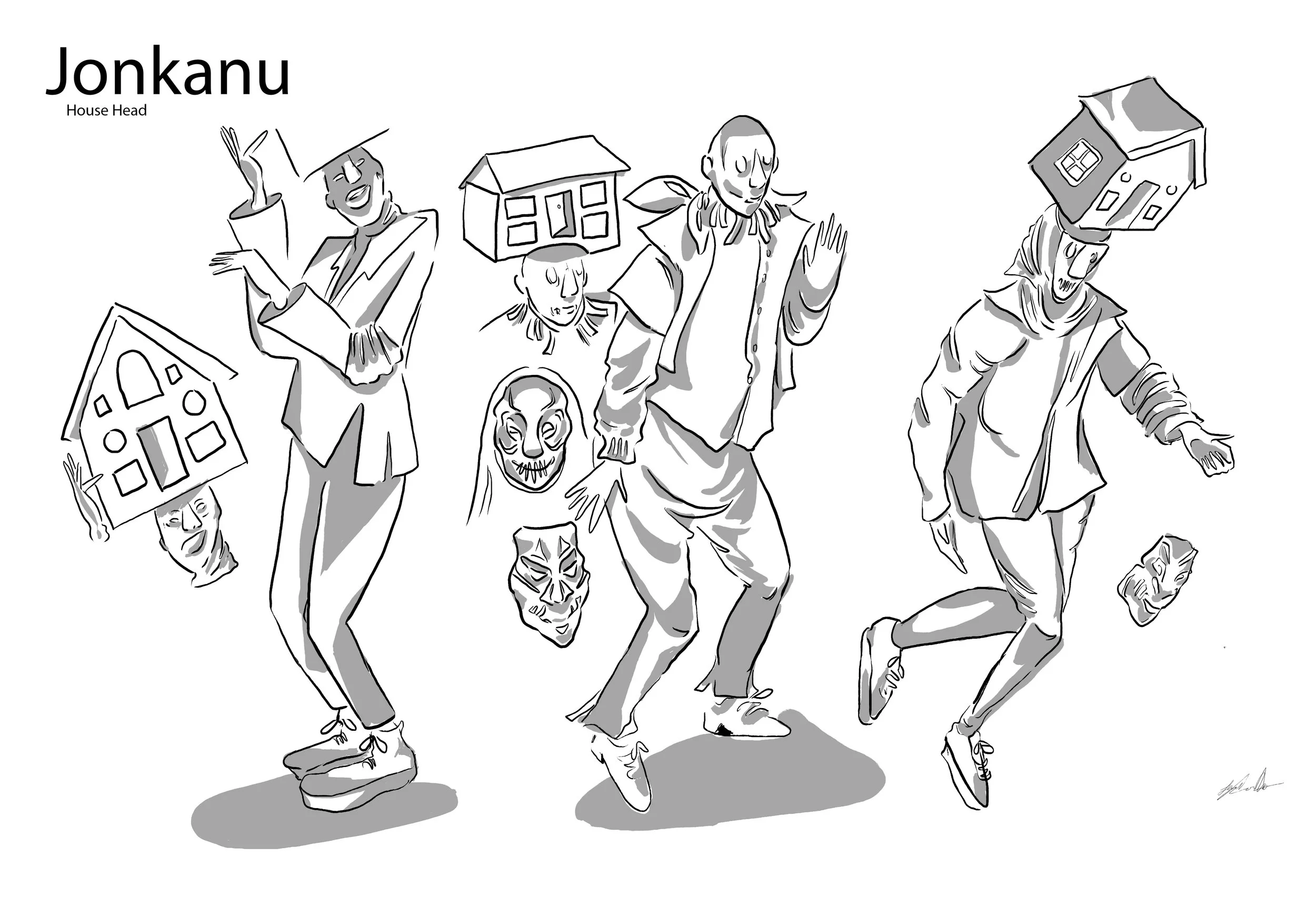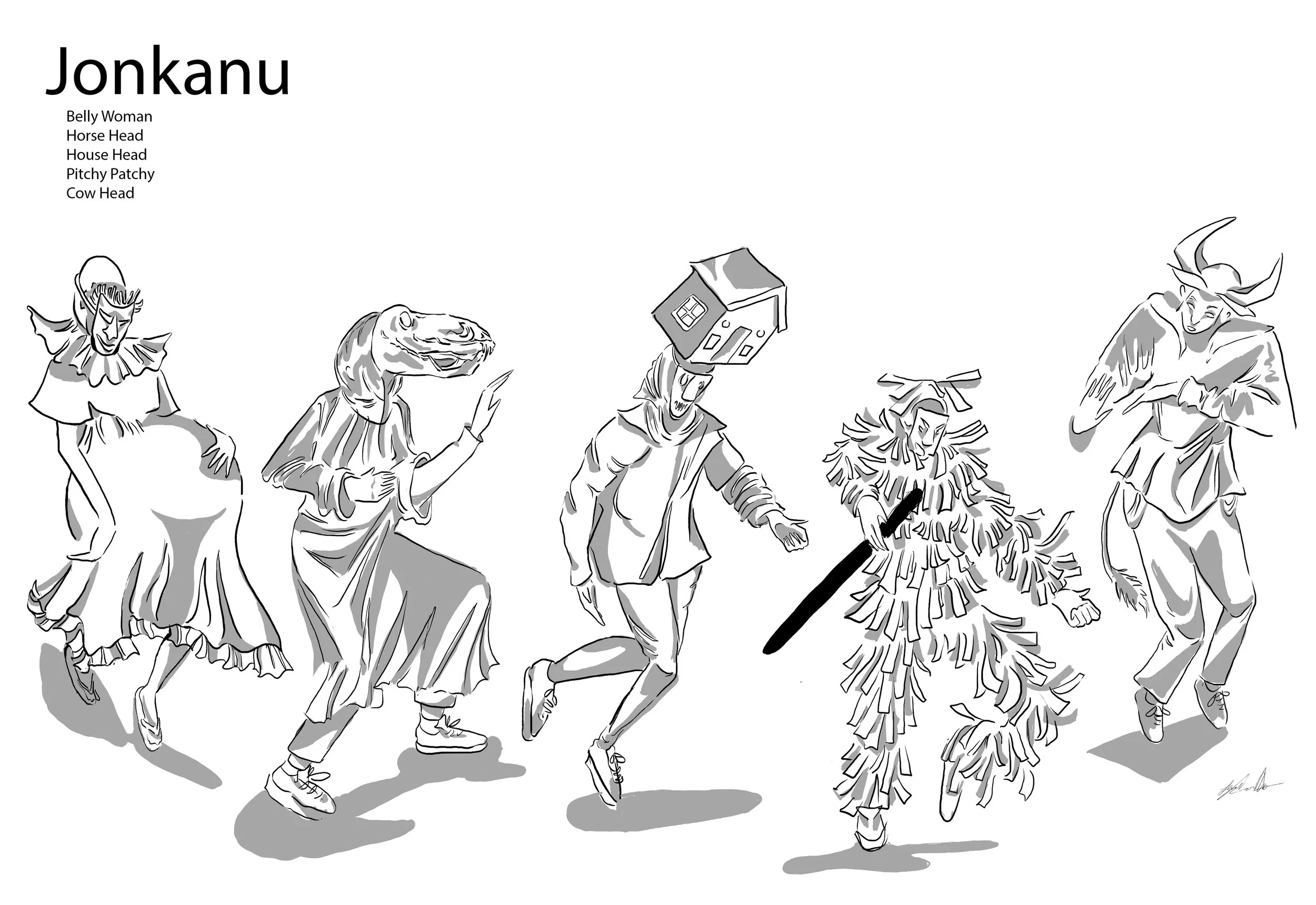 Character design for a series called Jonkanu, capturing the origins of Carnival through vibrant depictions of creative oppression. Each character shown from left to right as follows; Belly Woman, Horse Head, House Head, Pitchy Patchy and Cow Head. Commissioned by Desire Paths and featured as visual aid and promotional materials for events.