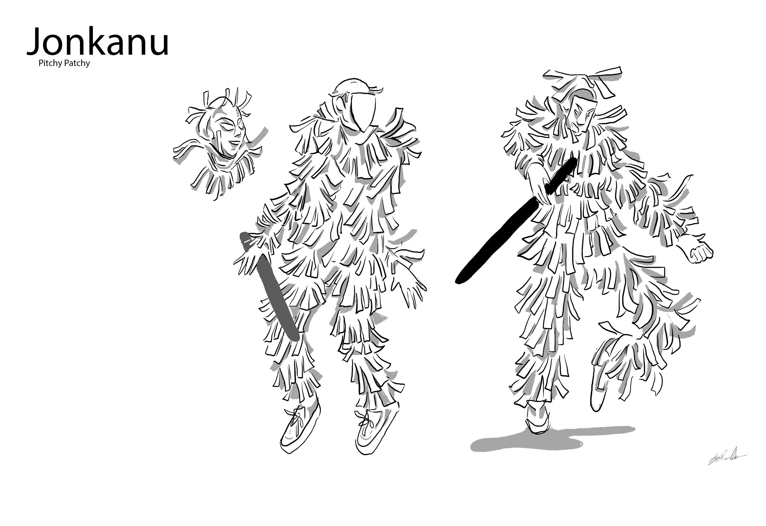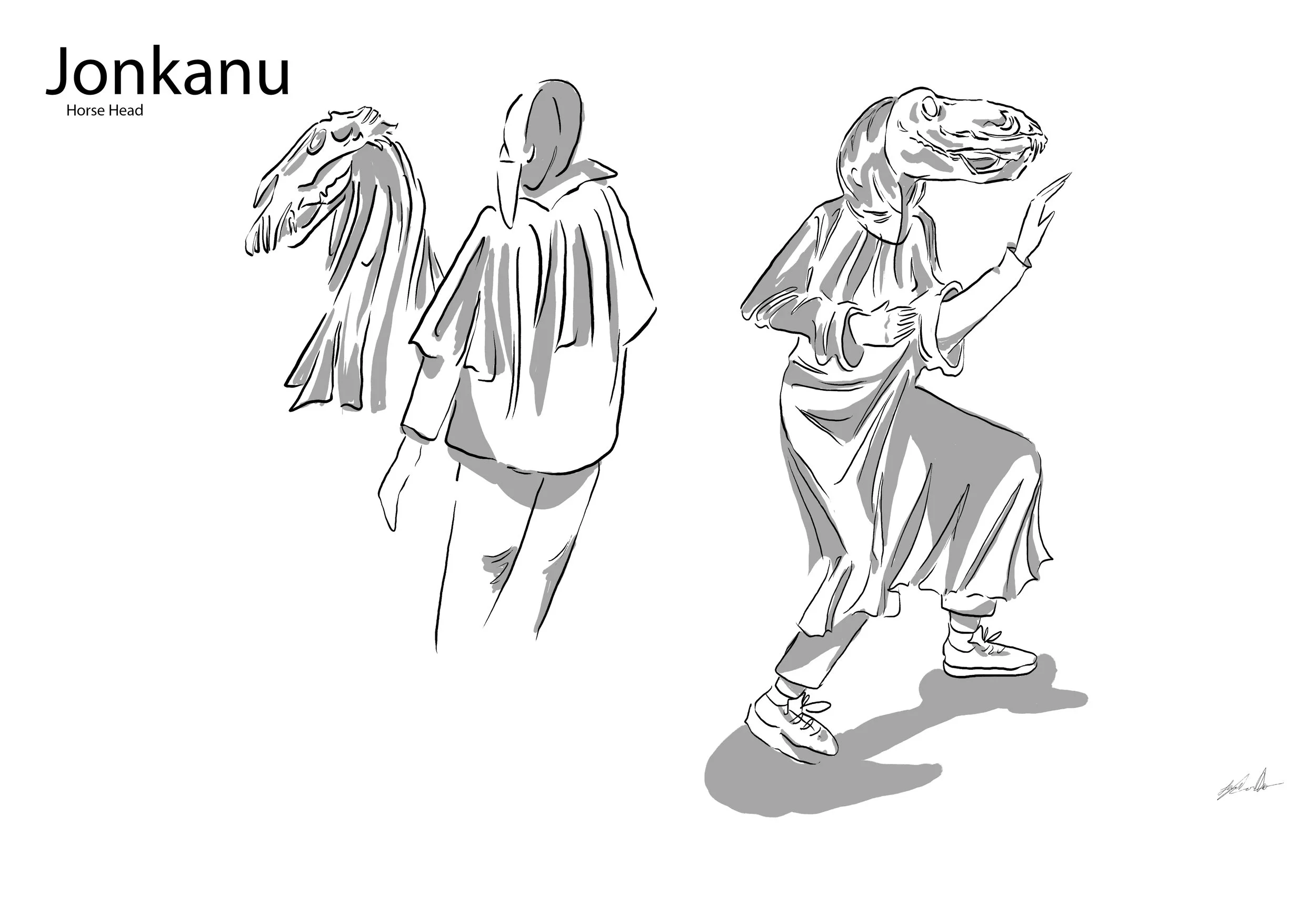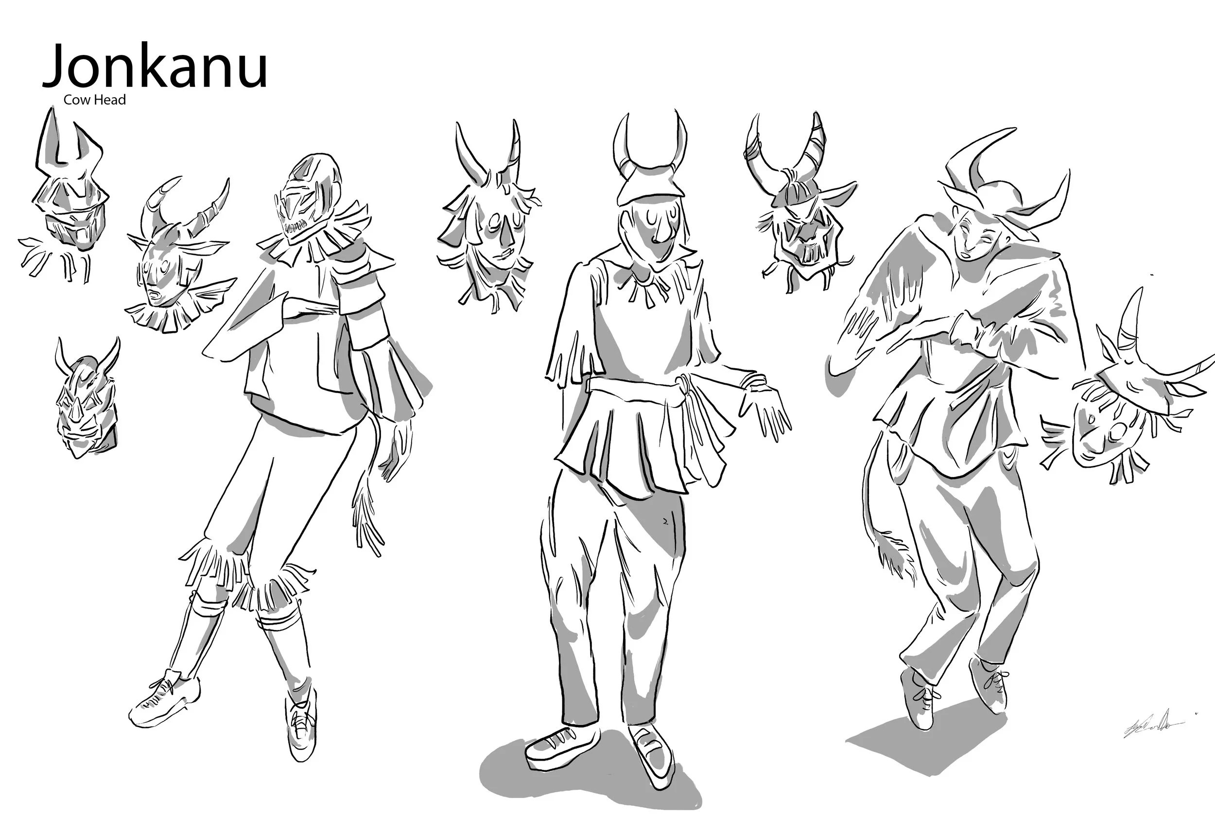 Character design for a series called Jonkanu, capturing the origins of Carnival through vibrant depictions of creative oppression. Each character shown from left to right as follows; Belly Woman, Horse Head, House Head, Pitchy Patchy and Cow Head. Commissioned by Desire Paths and featured as visual aid and promotional materials for events.