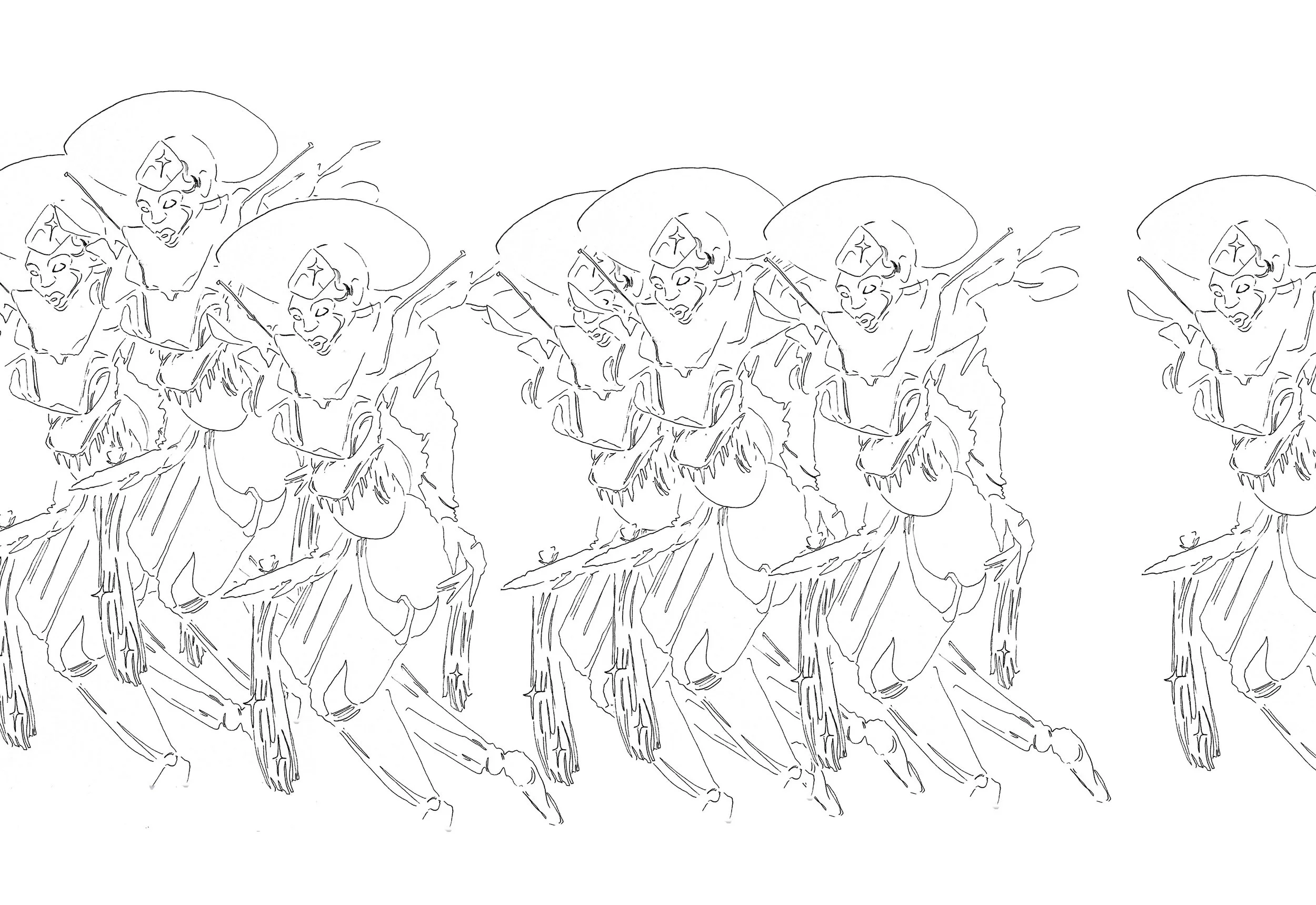 The compositions are comprised of fashion figures, space elements and vehicle motives.