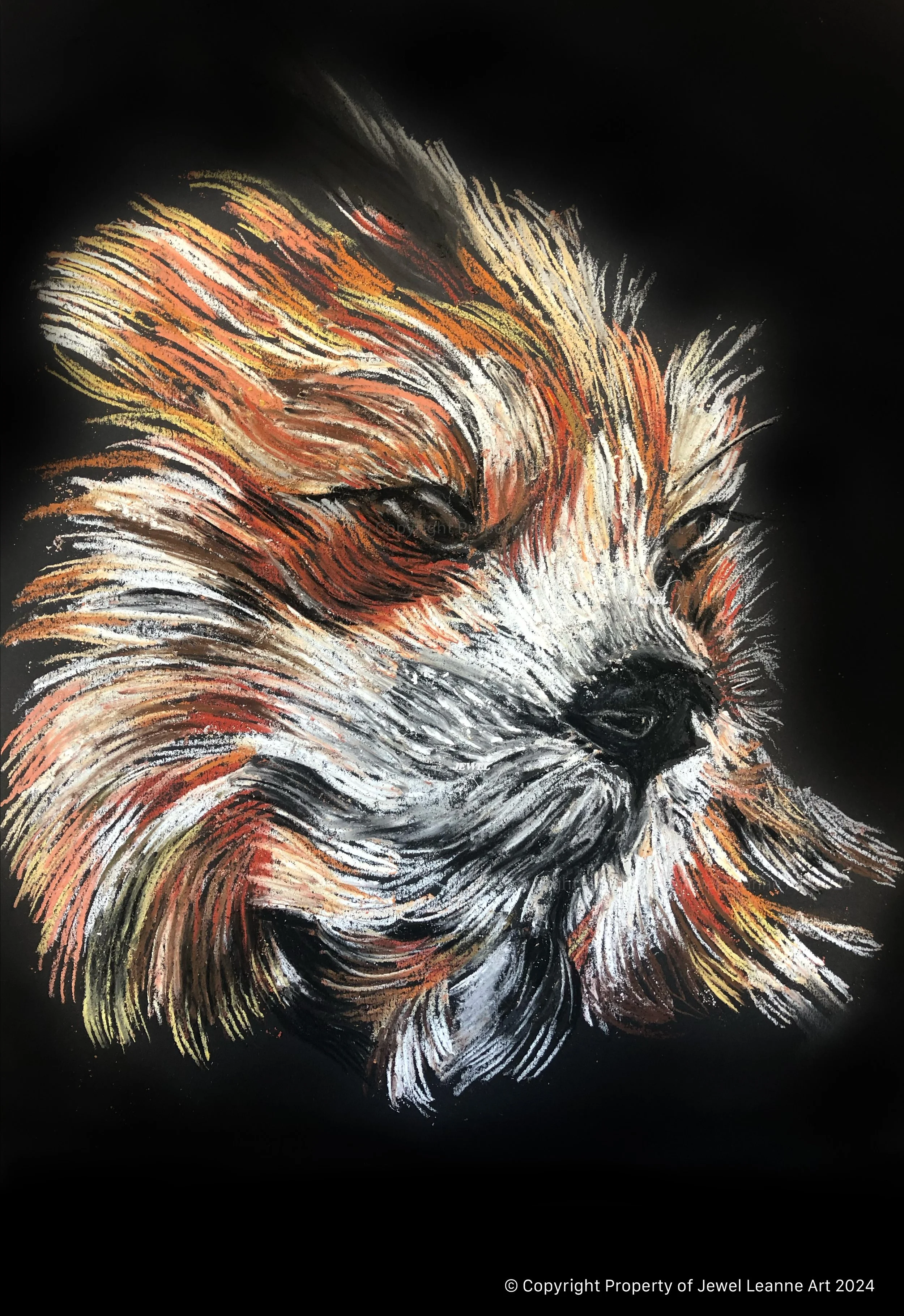 Featuring a Red Panda, Owl, Rabbit, Rabbit, Falcon. The artist worked form photographs, forming groups of colour palettes together with the chalk pastels to begin to re-create the animals in their respected colours. Intersecting and overlapping lines are expressed in a collection of mark makings to make up the final image.