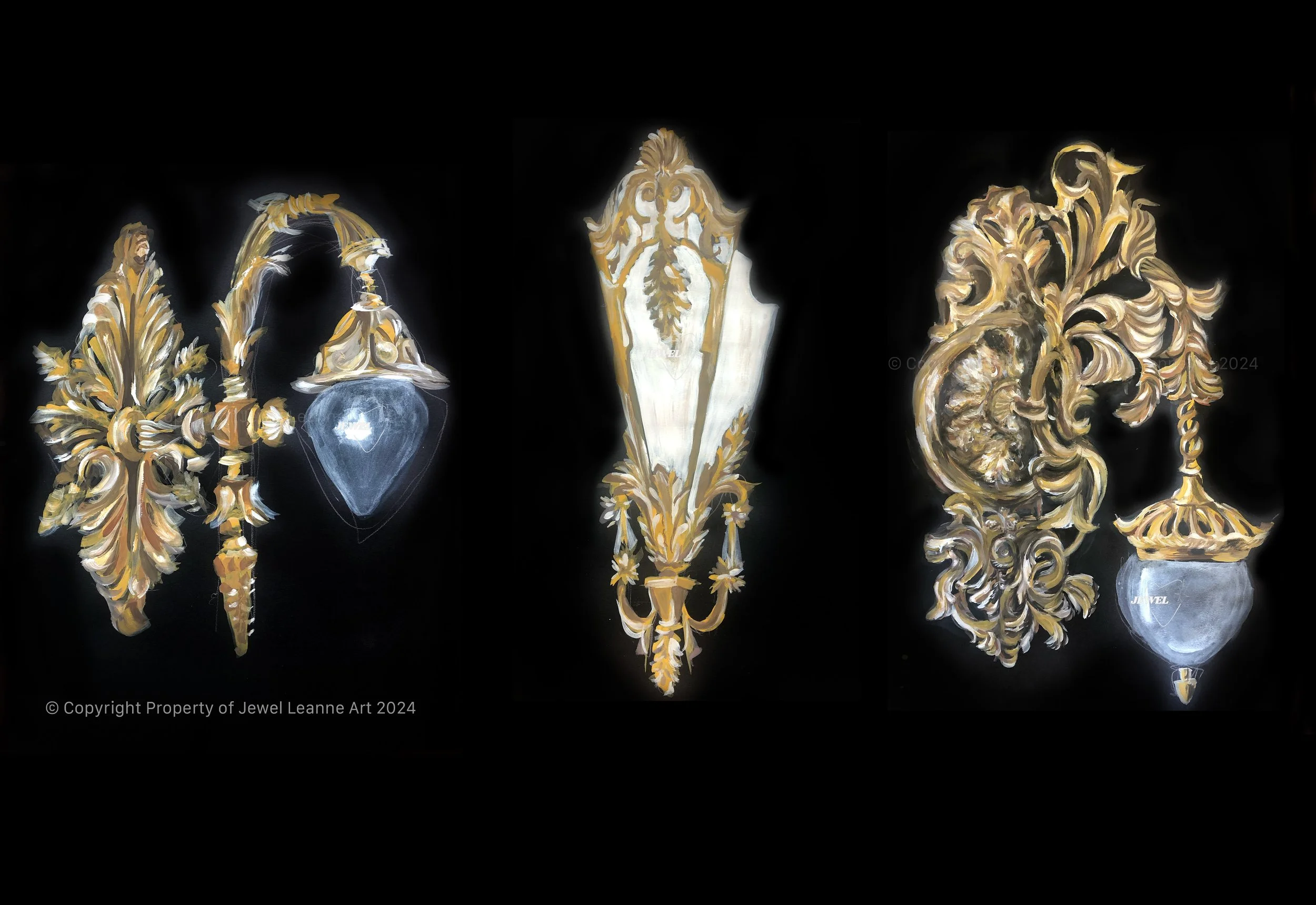 This triptych set of Antique Rococo light fixtures was created using gouache paint on black card. The three individual pieces of work was later merged to create a single composition. The artist wanted to capture the intricacies of the subject matter whilst looking at the various unique qualities that make up the ornate style.