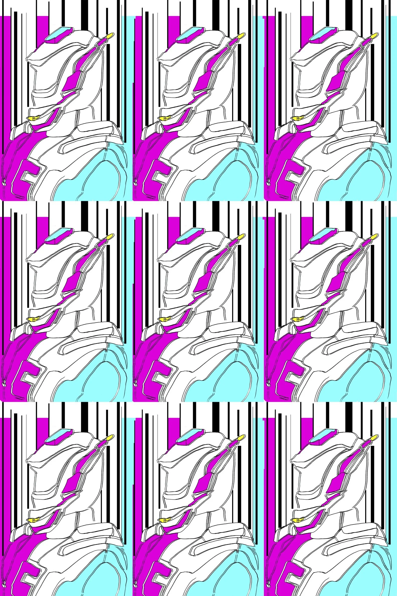 Glitch, digital wallpaper design inspired by barcodes. The structure of the image creates a rhythm as one element is repeated and rotated to form structure.